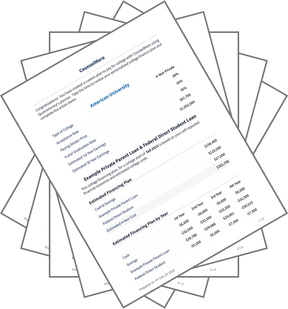 Manage college costs and the funding gap in minutes. Compare college financial aid packages side-by-side. Determine the best way to pay using federal student loans, private student loans & parent loans comparisons. Click here to see a video on college financial tools and professional development included in your CounselMore Student/Parent Portal.